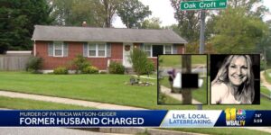Left inset: Footage apparently showing Karl Geiger dragging out a bloody mattress from his home after his ex-wife’s murder (WBAL/YouTube). Right inset: Patricia Watson-Geiger (Mitchell– Wiedefeld Funeral Home). Background: The …